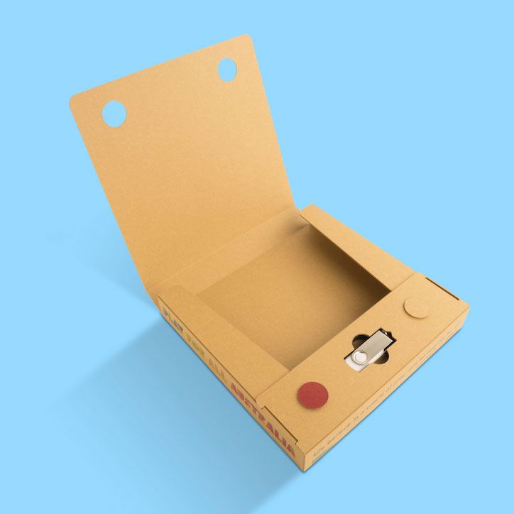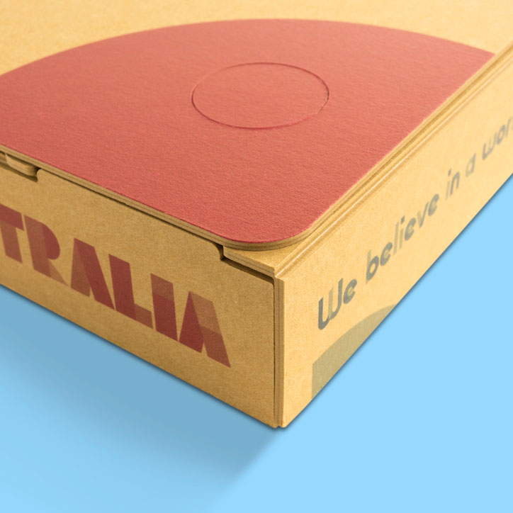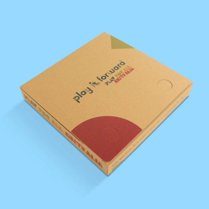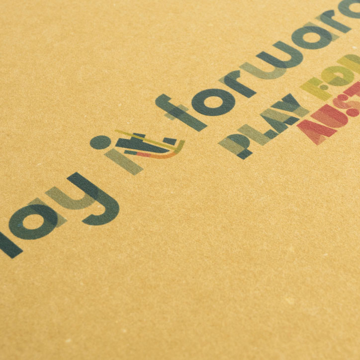 Play It Forward bespoke satchel made from 1500 um fibre board, digitally printed directly to the board, die cut to shape and featuring USB cavity & self locking discs.